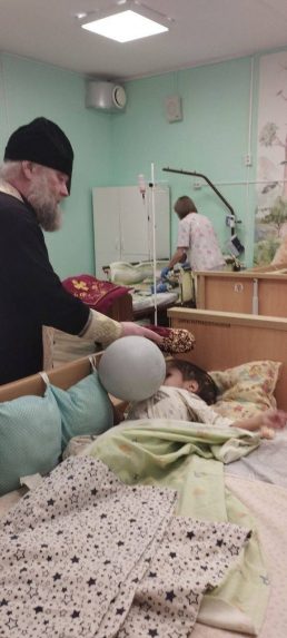 Башмачок святителя Спиридона принесли в паллиативное отделение, где настоятель домового храма интерната протоиерей Михаил Бобонин благословил детей.
