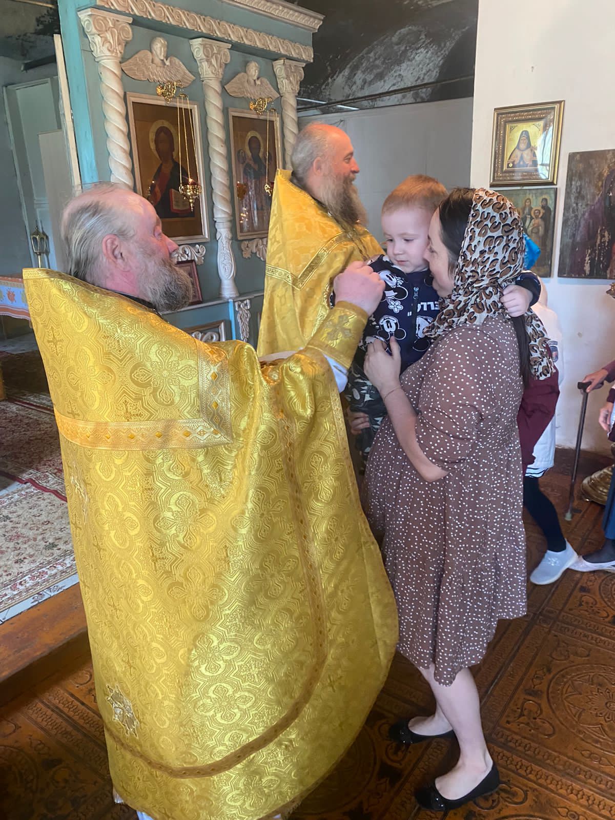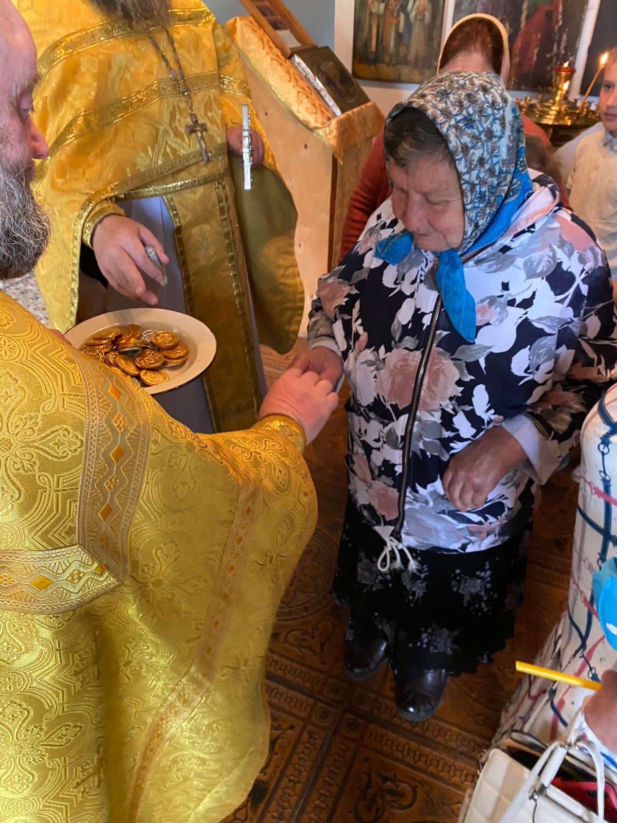 Для поклонения верующих отец Михаил привез на богослужение святыни, недавно переданные нашему приходу: икону святителя и чудотворца Николая с частицей его мощей и деревянный крест со Святой Горы Афон.